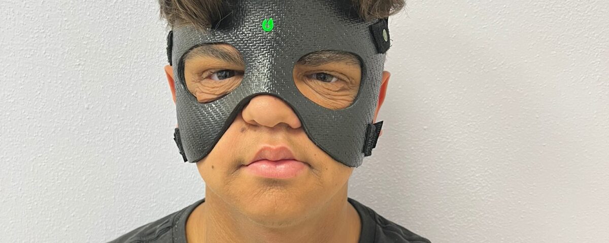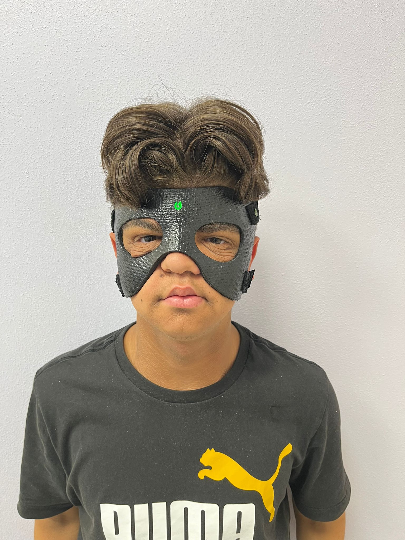 Presa questa decisione dopo pochi giorni Pietro è venuto a trovarci nella nostra sede centrale di Fidenza (PR) accompagnato dal papà. Dopo essersi presentati ci hanno spiegato bene tutte le particolarità della sindrome e le necessità specifiche di protezione che aveva Pietro. Le zone da proteggere dove c’erano le maggiori criticità erano le orbite oculari, la fronte e il naso. Quindi la maschera avrebbe dovuto assumere una forma molto anatomica andandosi ad allargare su entrambi gli zigomi per poter trovare dei punti “sani” di appoggio, andandosi invece a distanziare dalle zone più sensibili lasciando giusto 1 o 2 millimetri di spazio vuoto. Questo sottilissimo spazio consente alle zone che necessitano di protezione di non subire contraccolpi in caso di contatti violenti sul viso, che saranno invece scaricati sulle zone “sane” del volto in cui la maschera si va ad appoggiare. Quindi, dopo aver capito bene con Pietro le necessità fondamentali che aveva, siamo partiti da una scansione 3D del suo viso e da lì in circa due ore aveva indosso la sua protezione su misura. Che figurava così: