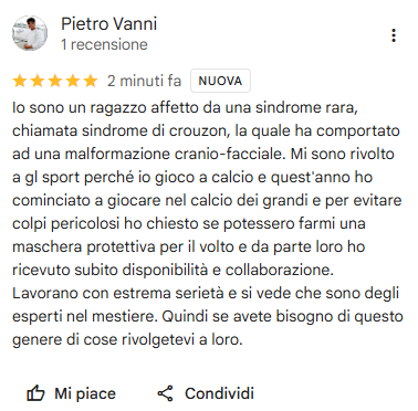 La maschera gli calzava perfettamente e proteggeva tutte le zone del suo viso che necessitavano un occhio di riguardo. Ora Pietro da un po’ di tempo gioca in categoria tranquillamente e senza temere niente e nessuno. Una situazione completamente nuova per lui e che ci ha testimoniato con alcune righe di recensione che ci hanno davvero riempito il cuore!